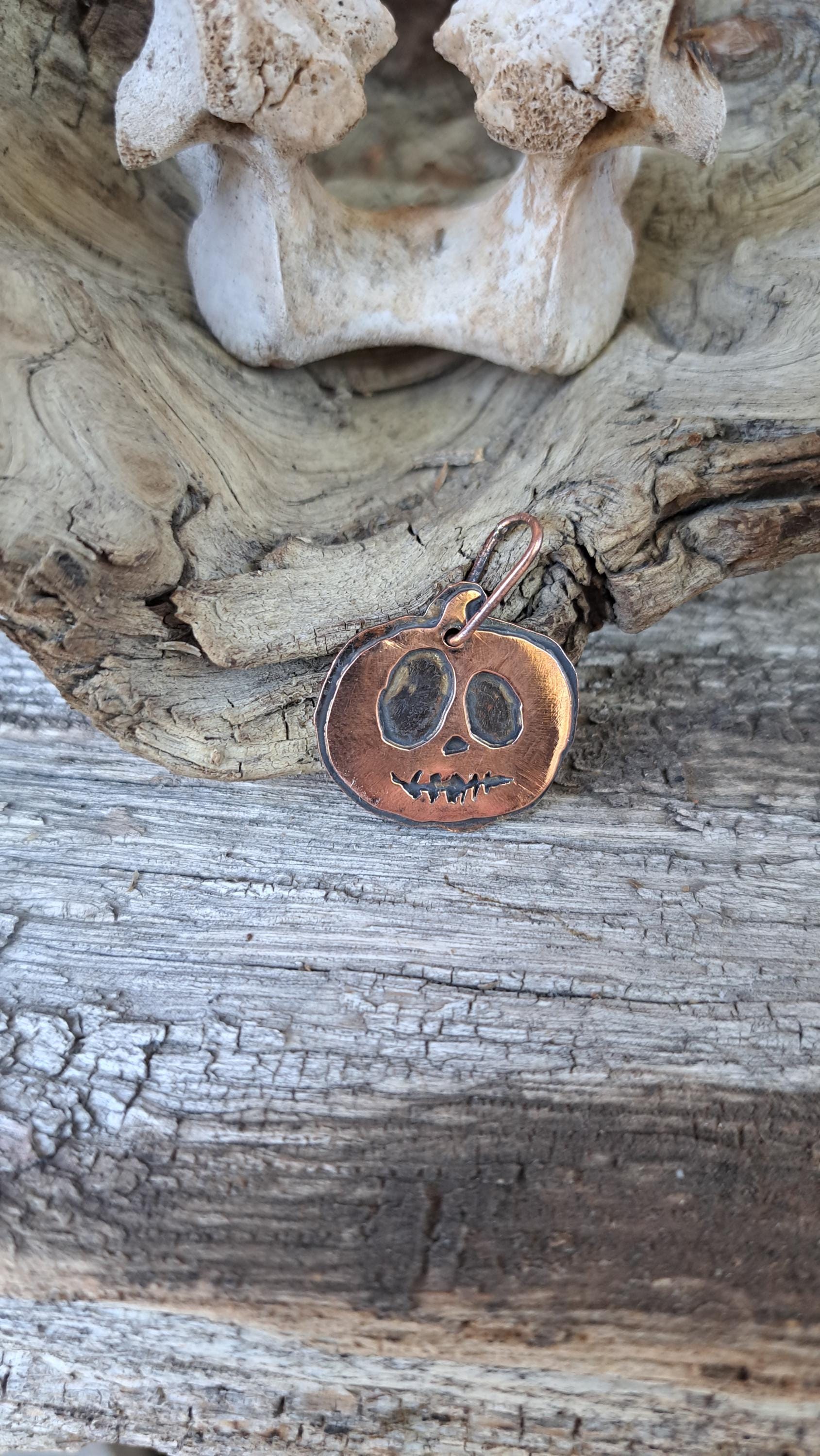 About 1.5 inches in size, it hangs from a small copper loop. Perfect for Halloween or spooky style year-round, this pendant is a fun and unique piece for anyone who loves handmade or seasonal jewelry.