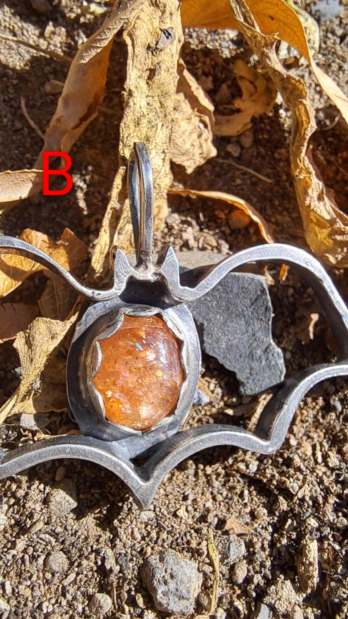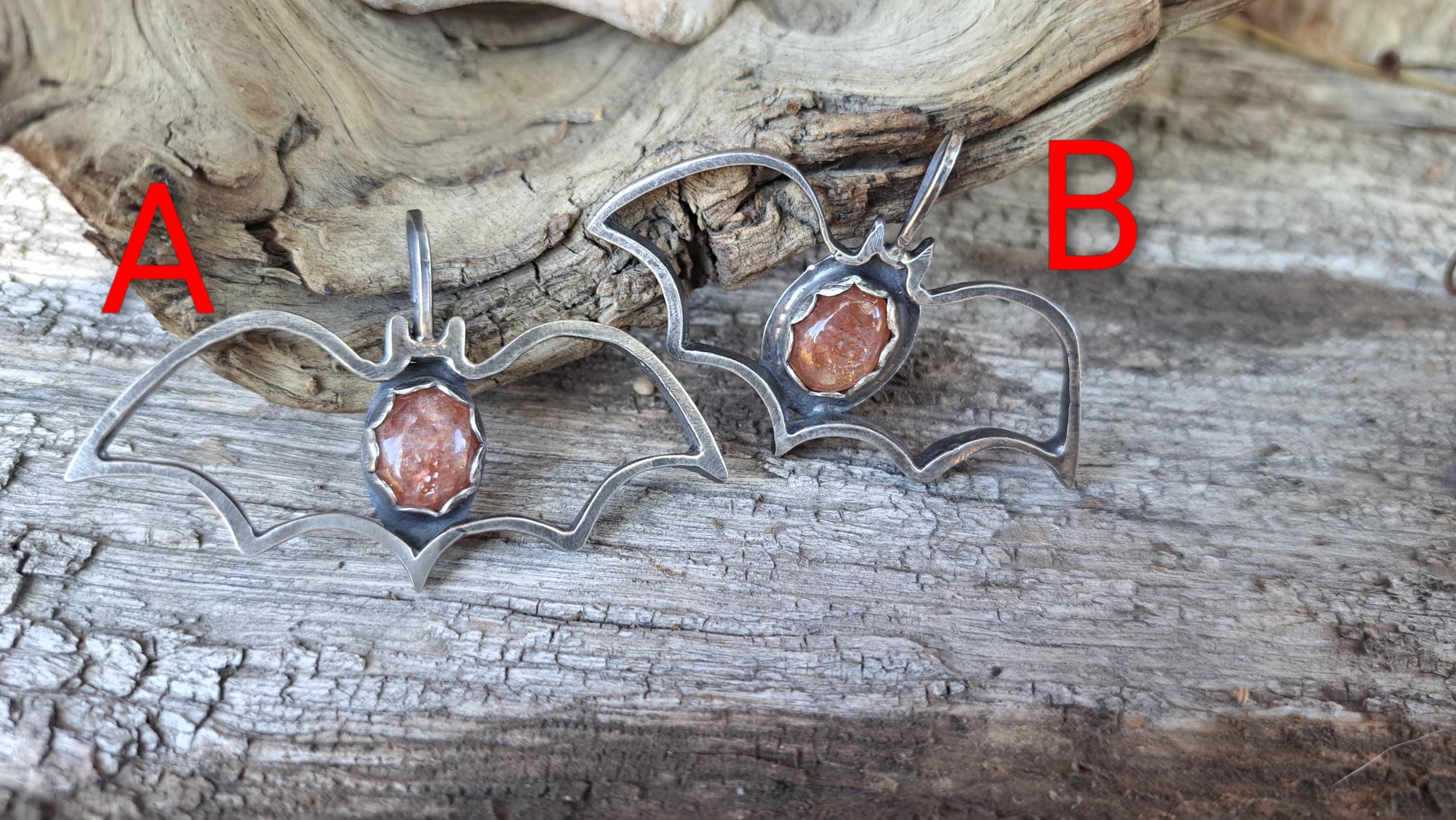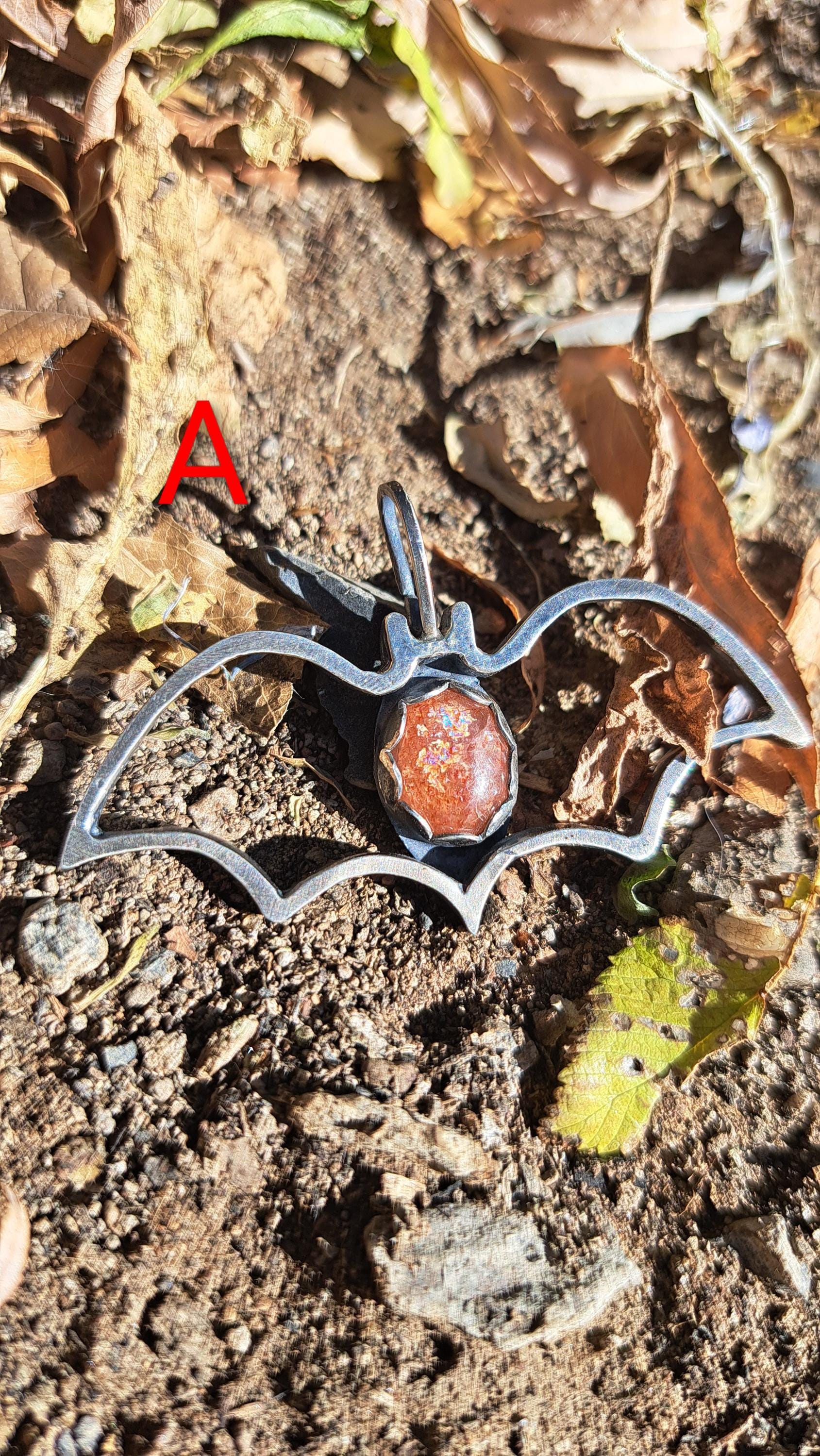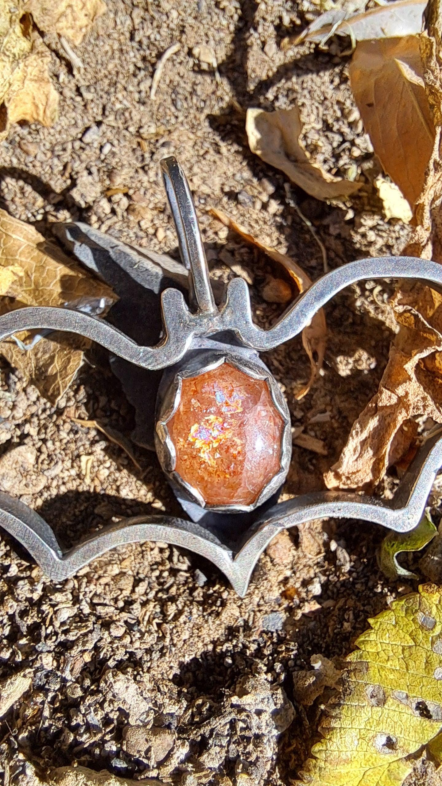 **Bat Pendant with Rainbow Confetti Sunstone – Oxidized Sterling Silver**
