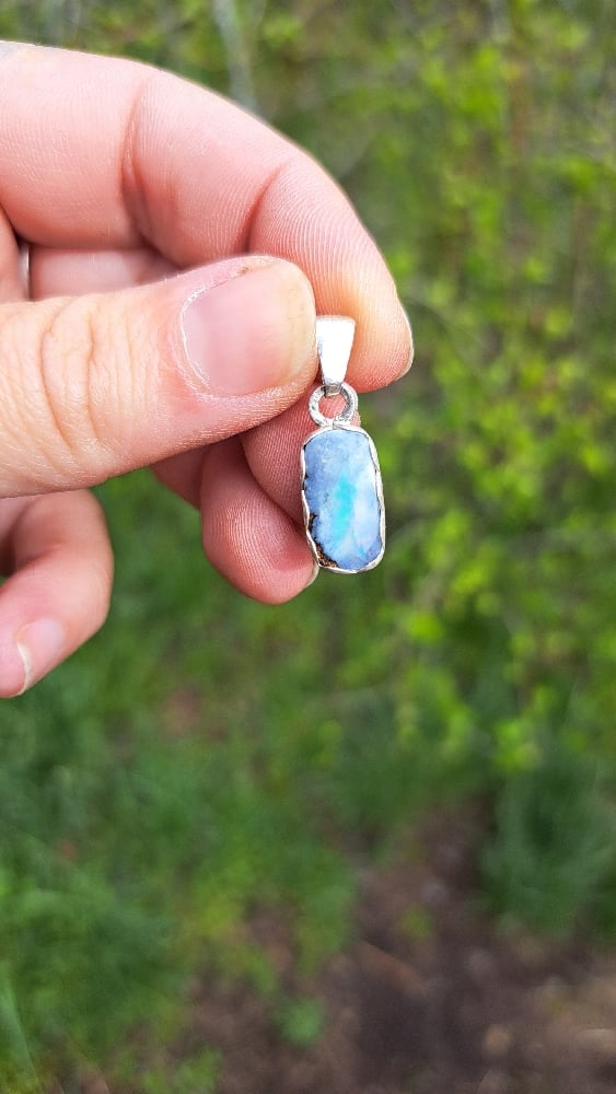 This pendant features A tiny rectangle of Australian opal that glimmers like a secret piece of sky, flickering with soft blues, greens, and hints of fire. Set gently in cool sterling silver, it feels both simple and a little magical—like something you’d find tucked away in a tidepool or hidden in a dream. Small, bright, and quietly enchanting.