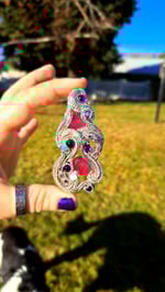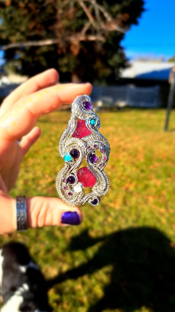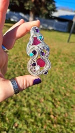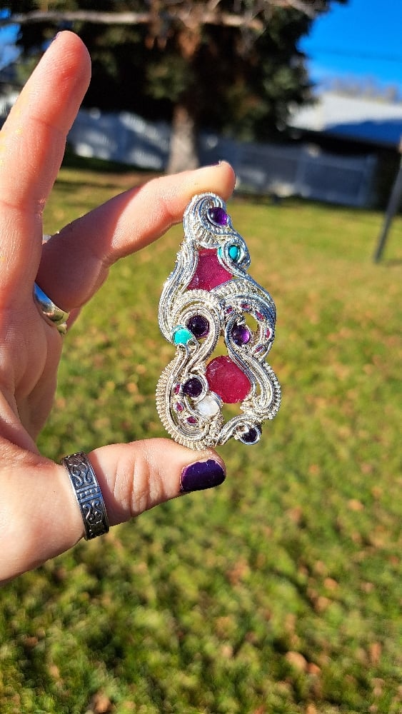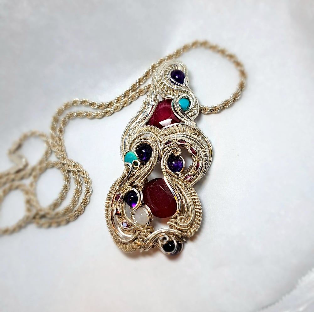 This elegant wire-wrapped pendant features two large ruby facets as its centerpiece, glowing with rich red color. They’re complemented by a soft, luminous moonstone cabochon, two vibrant turquoise cabochons, four deep purple amethyst cabochons, and eight smaller ruby facets for added sparkle.